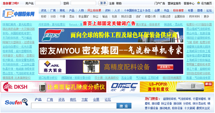 包含中國粉體網首頁個性關鍵詞服務、中國粉體搜索搜索關鍵詞排名服務,給企業(yè)創(chuàng)造更多被潛在客戶找到的機會。另外,關鍵詞推廣相對翻牌廣告費用較低,是相關企業(yè)宣傳推廣自己的產品、提高企業(yè)知名度的一種非常行之有效的方法。